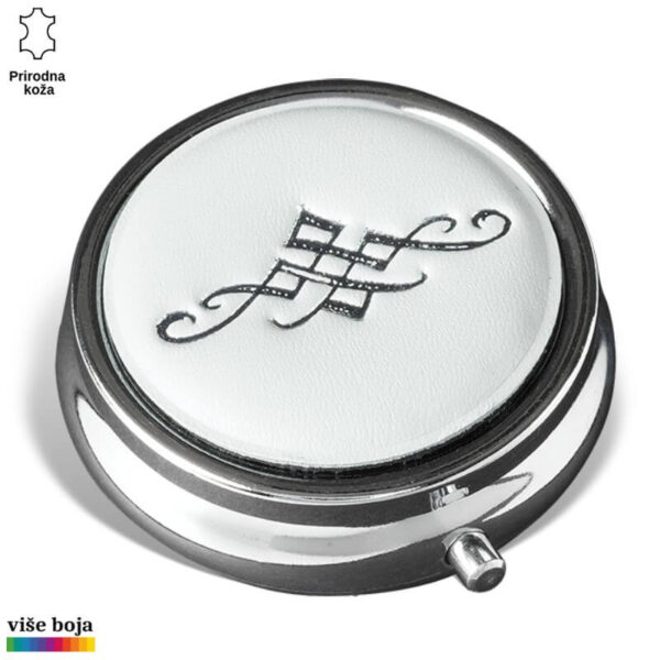 Ovaj praktičan proizvod je izrađen od inox-a, sa poklopcem presvučenim visokokvalitenom goveđom kožom. Unutra ima 3 plastične pregrade namenjene za podelu lekova. Izrađuje se u više atraktivnih boja. Na sam artikal, kao i na luksuznu ambalažu u kojoj dolazi, može se utiskivati logo naručioca.