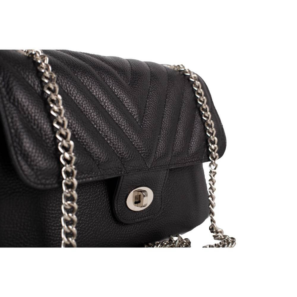 Trendy ženska tašna izrađena od kvalitetne prirodne kože. Unutrašnjost je veoma praktična i komotna, sa odvojenim džepom. Ima dugačak metalni lanac a izgled tašne je upotpunjen metalnom bravicom i pločicom Falco.