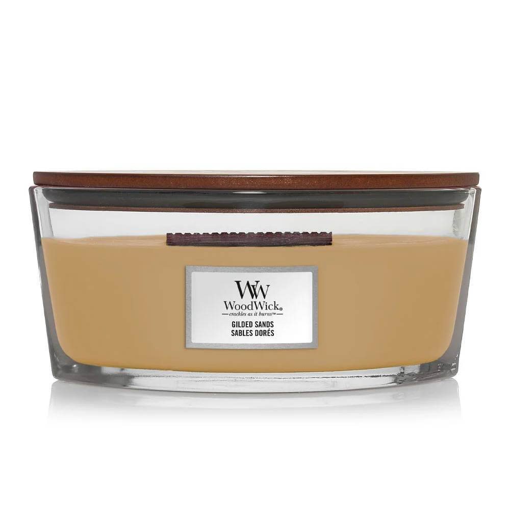 Mirisna sveća gilded sands elipsa, woodwick brenda, bež boje u staklenoj tegli. GILDED SANDS ELIPSA MIRISNA SV...