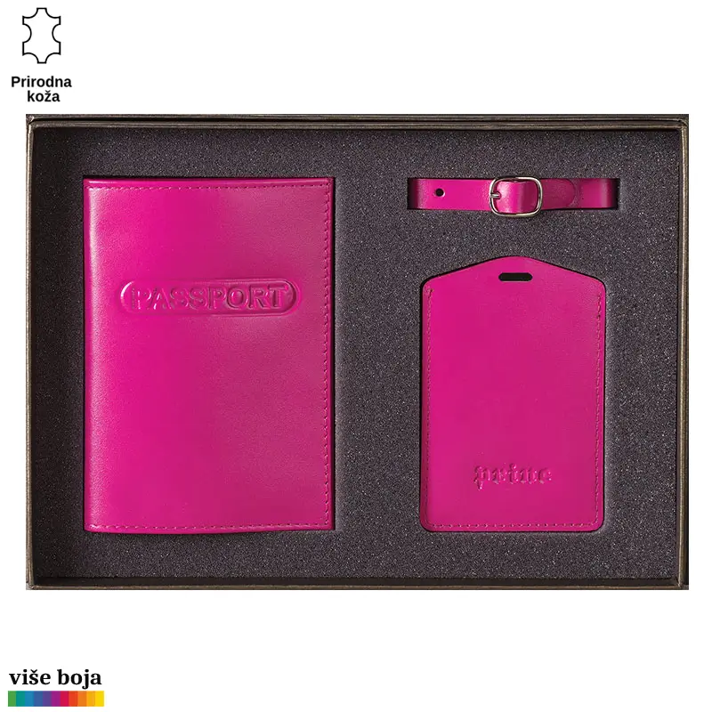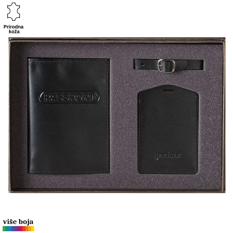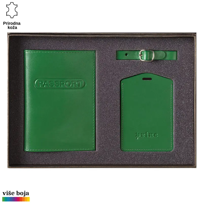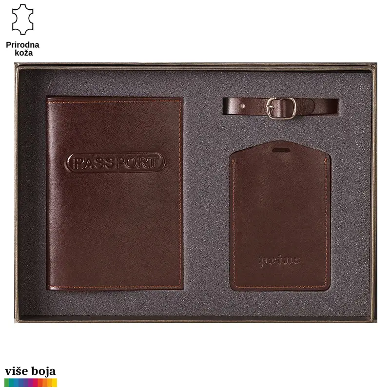 Ovaj poklon set sadrži dva artikla, ručno izrađena od visokokvalitetne goveđe kože, upakovana u luksuznu ambalažu postavljenu sunđerom. Futrola štiti i ukrašava pasoš, dok identifikacija služi za obeležavanje torbi i kofera za putovanja. Ispod prozorčića od PVC plastike nalazi se kartica od specijalnog kartona koja se lako izvlači za potrebe upisivanja podataka, a kaiš je kasnije drži tako da ne može da ispadne i ostaje suva i zaštićena. Set se izrađuje u više atraktivnih boja. Na artikle, kao i na luksuznu ambalažu u koju je set upakovan, može se utiskivati logo naručioca.