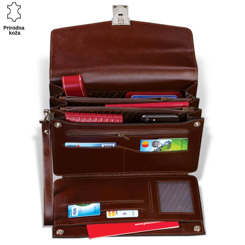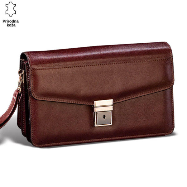 Ova praktična muška torbica je ručno izrađena od visokokvalitetne goveđe kože, malih dimenzija ali dovoljna za sve neophodne stvari koje trebaju jednom poslovnom muškarcu. Moderna niklovana bravica sa ključićem je, ne samo ukras na poklopcu, već i ono što obezbeđuje sigurnost sadržine torbice, a sa strane je zakačen kaiščić za nošenje ovog artikla u ruci. Za ovako malu torbicu, unutrašnjost je vrlo prostrana i sadrži tri osnovne pregrade, 2 sa rajsferšlusima, jedan skriveni džep i dve pregrade za kartice. Ono što ovu torbicu čini tako kompaktnom i praktičnom je što se ispod glavnog poklopca torbe nalazi jedan kožni poklopac koji se može otvoriti pomoću dva drihera. Tu se nalazi dodatni veliki džep, dve pregrade za dokumenta, i prozorčić od PVC plastike za ličnu kartu, vozačku ili saobraćajnu dozvolu, i sl. Predviđena je kako za nošenje u elegantnim, poslovnim i svečanim prilikama, tako i za svakodnevnu upotrebu. Izrađuje se u crnoj i braon boji i dolazi upakovana u tkanoj vrećici. Na sam artikal se može utiskivati logo naručioca.