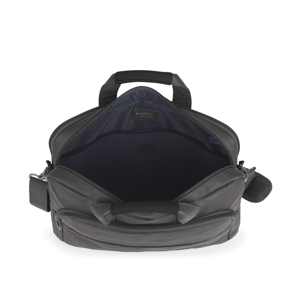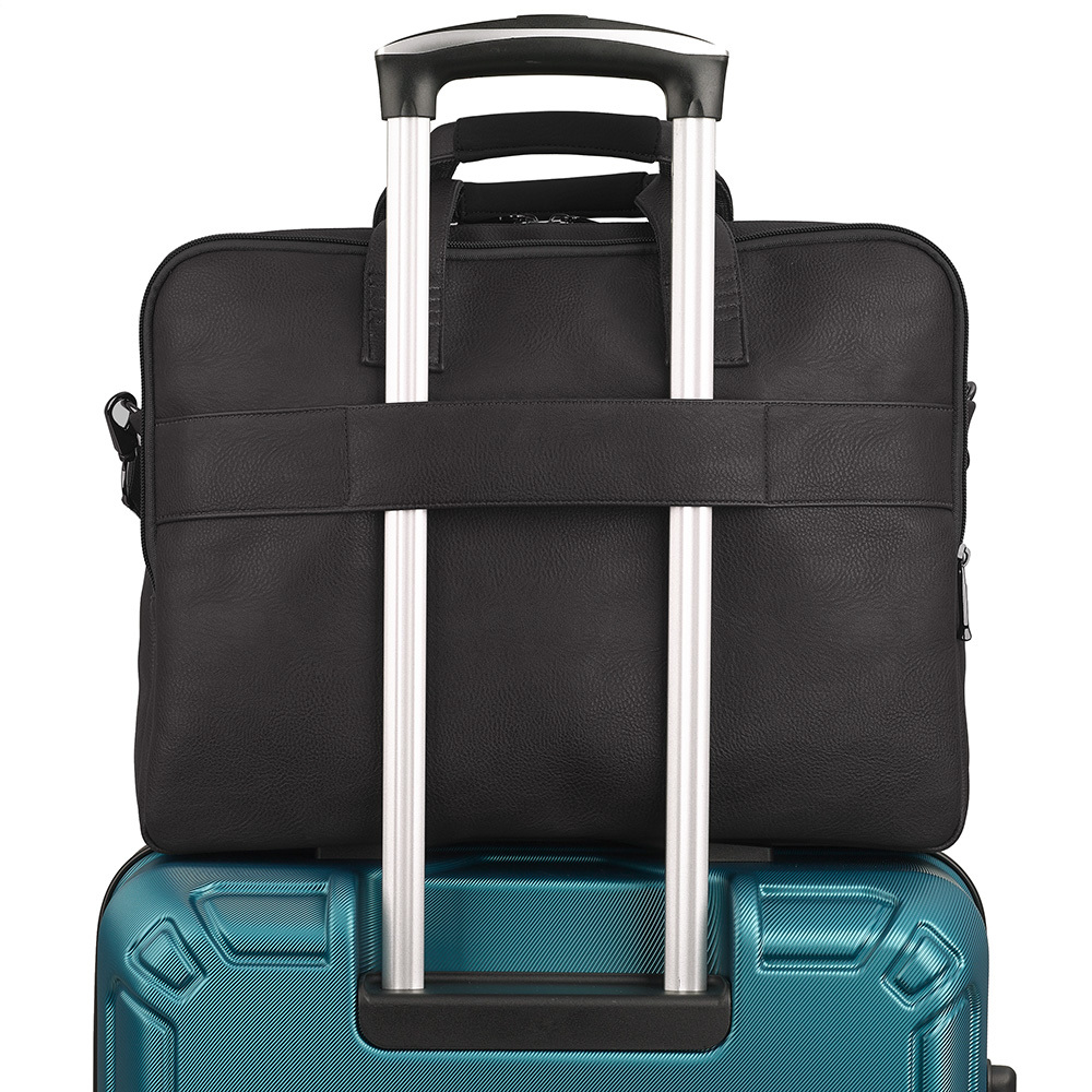 Elegantna i moderna muška torba za notebook, izrađena od visokokvalitetne veštačke kože, sa „PVC free“ oznakom. Sadrži dva unutrašnja odeljka, uključujući i zaštićeni prostor za odlaganje kompjutera 15,6″.na prednjoj strani se nalazi veliki džep sa rajsferšlusom. Moguća je montaža na ručku kofera.