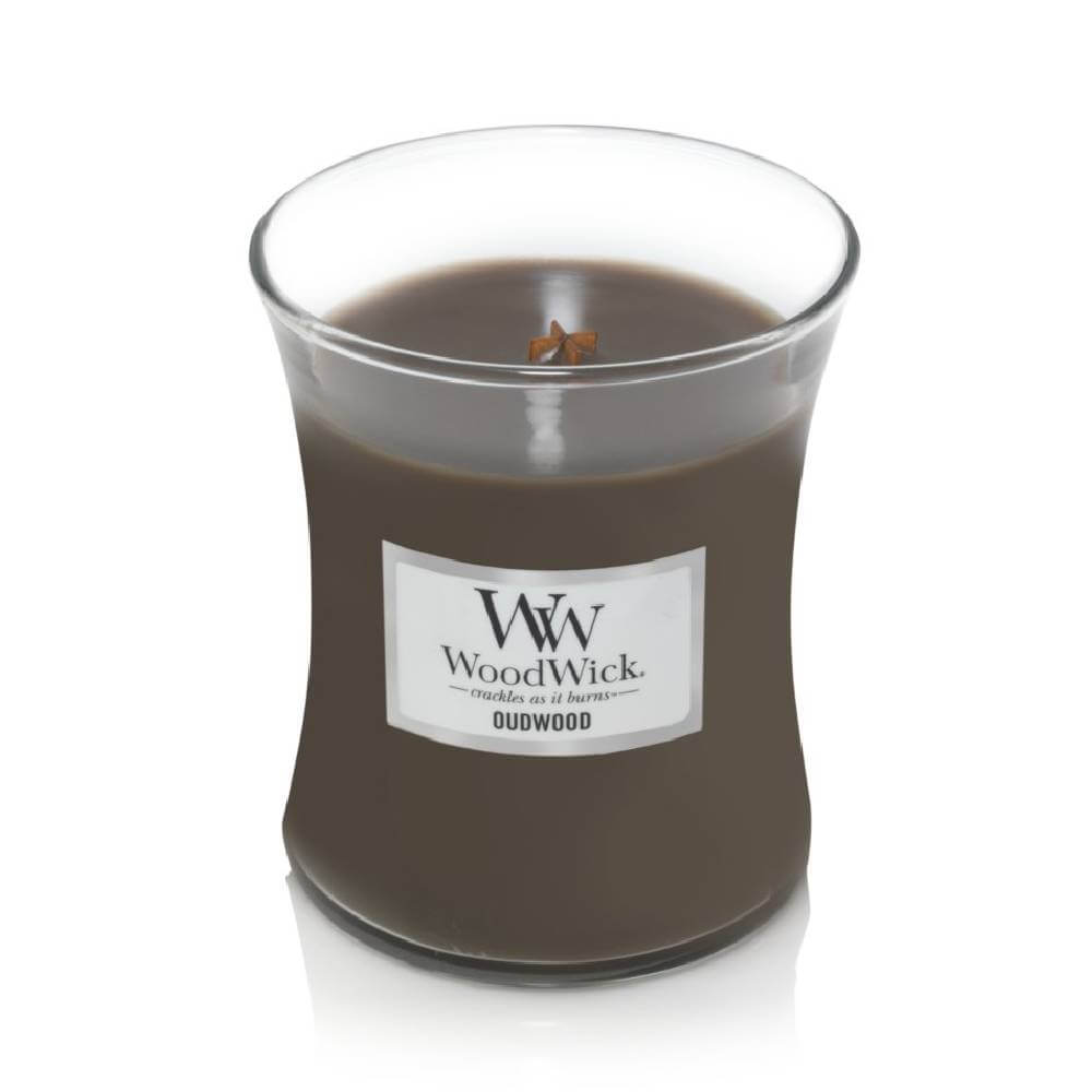 Sveća brenda WoodWick u staklenoj čaši sa natpisom "Oudwood" i drvenim fitiljem. OUDWOOD MEDIUM CLASSIC MIRISNA...