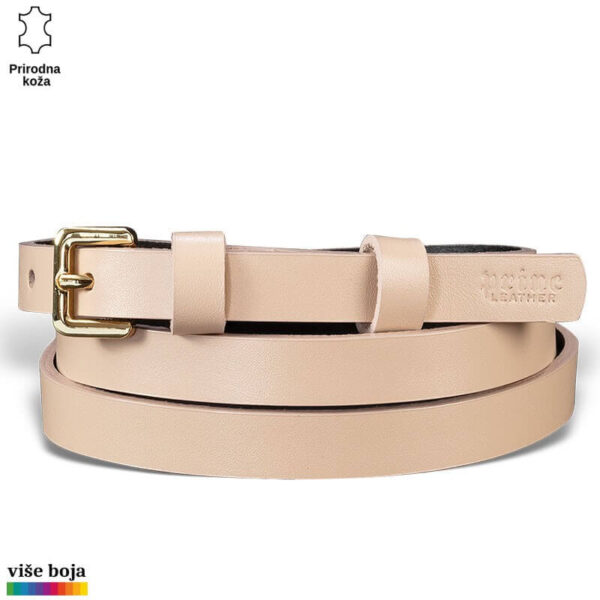 Ovaj elegantni ženski kaiš je ručno napravljen od visokokvalitetne debele goveđe kože, pogodan za nošenje preko haljina, bluza, na struku ili na bokovima. Kožna kapa, na koju je prišivena metalna šnala zlatne boje, je za kaiš pričvršćena šrafom, tako da po potrebi sami možete skratiti kaiš. Izrađuje se u više dužina i atraktivnih boja. Na sam artikal, kao i na luksuznu ambalažu u kojoj dolazi, može se utiskivati logo naručioca.