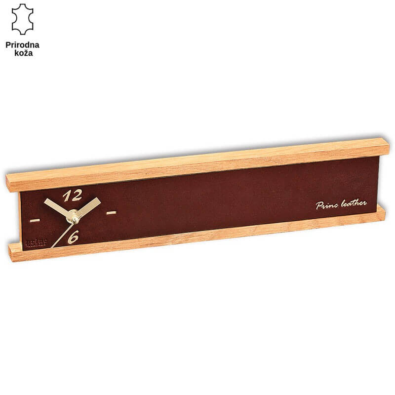 Drveni zidni sat sa detaljima od tamnosmeđe kože ZIDNI SAT PRAVOUGAONI VODORAVN...