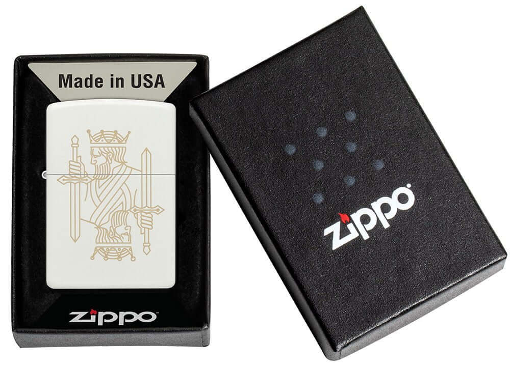 Beli Zippo upaljač King Queen 49847 | Kraljevski beli mat upaljač na kojem se sa jedne strane nalazi kralj, a sa druge kraljica.